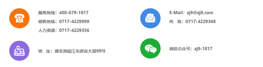 服務熱線:4006791817 人力資源部:0717-4229356 郵政編碼:443200 E-mail:zj9@zj9.com 地址:湖北省枝江市迎賓大道99號 鄂ICP備05003662號-1