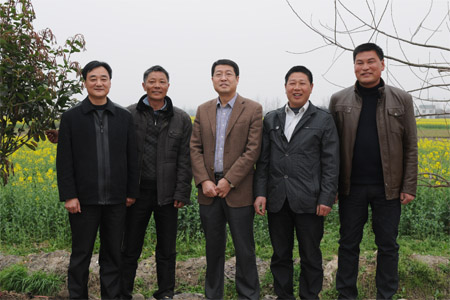 枝江酒業(yè)董事長蔣紅星(左一)、黨委書記張華(左三)與泰洲村支書王明星(左二)等村委 合影留戀 3月11日,枝江酒業(yè)董事長…