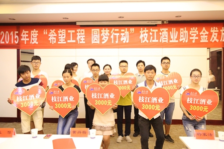 8月25日,由枝江酒業(yè)股份有限公司、共青團枝江市委共同主辦的2015年度“希望工程?圓夢行動”枝江酒業(yè)助學金發(fā)放儀式在枝江國酒舉行。市委常委、宣傳部部長黃丹梅,枝江酒業(yè)股份有限公司黨委書記張華等出席儀式。在活動現(xiàn)場,枝江酒業(yè)為枝江市100名家境貧寒、成績優(yōu)異的準大學生發(fā)放30萬元助學金。來自顧家店鎮(zhèn)受助學生代表王慧玲說:“感謝各位領導和枝江酒業(yè)對我的幫助,在以后的學習和生活中,我會更加努力奮進,待我學有所成,定會回饋社會,幫助那些同樣需要幫助的人,讓這份愛心繼續(xù)傳遞下去。”