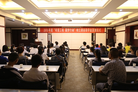 8月25日,由枝江酒業(yè)股份有限公司、共青團枝江市委共同主辦的2015年度“希望工程?圓夢行動”枝江酒業(yè)助學金發(fā)放儀式在枝江國酒舉行。市委常委、宣傳部部長黃丹梅,枝江酒業(yè)股份有限公司黨委書記張華等出席儀式。在活動現(xiàn)場,枝江酒業(yè)為枝江市100名家境貧寒、成績優(yōu)異的準大學生發(fā)放30萬元助學金。來自顧家店鎮(zhèn)受助學生代表王慧玲說:“感謝各位領導和枝江酒業(yè)對我的幫助,在以后的學習和生活中,我會更加努力奮進,待我學有所成,定會回饋社會,幫助那些同樣需要幫助的人,讓這份愛心繼續(xù)傳遞下去。”