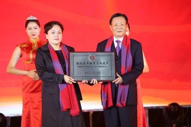 宜昌市非遺中心主任林鴻為枝江酒業(yè)授予湖北省第五批非物質(zhì)文化遺產(chǎn)保護名目的匾牌